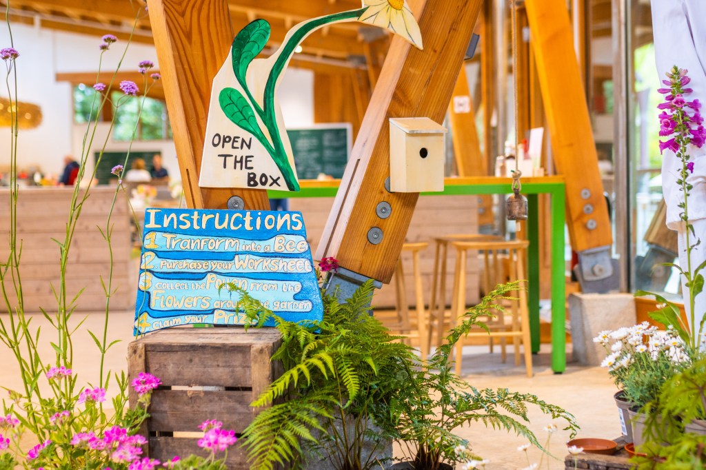 So I developed a ‘Bee Transformation Station’ which signalled the start of the trail. Children would arrive, collect their worksheet and then transform into bees with the aim to collect the pollen from the flowers which were dotted around the garden.