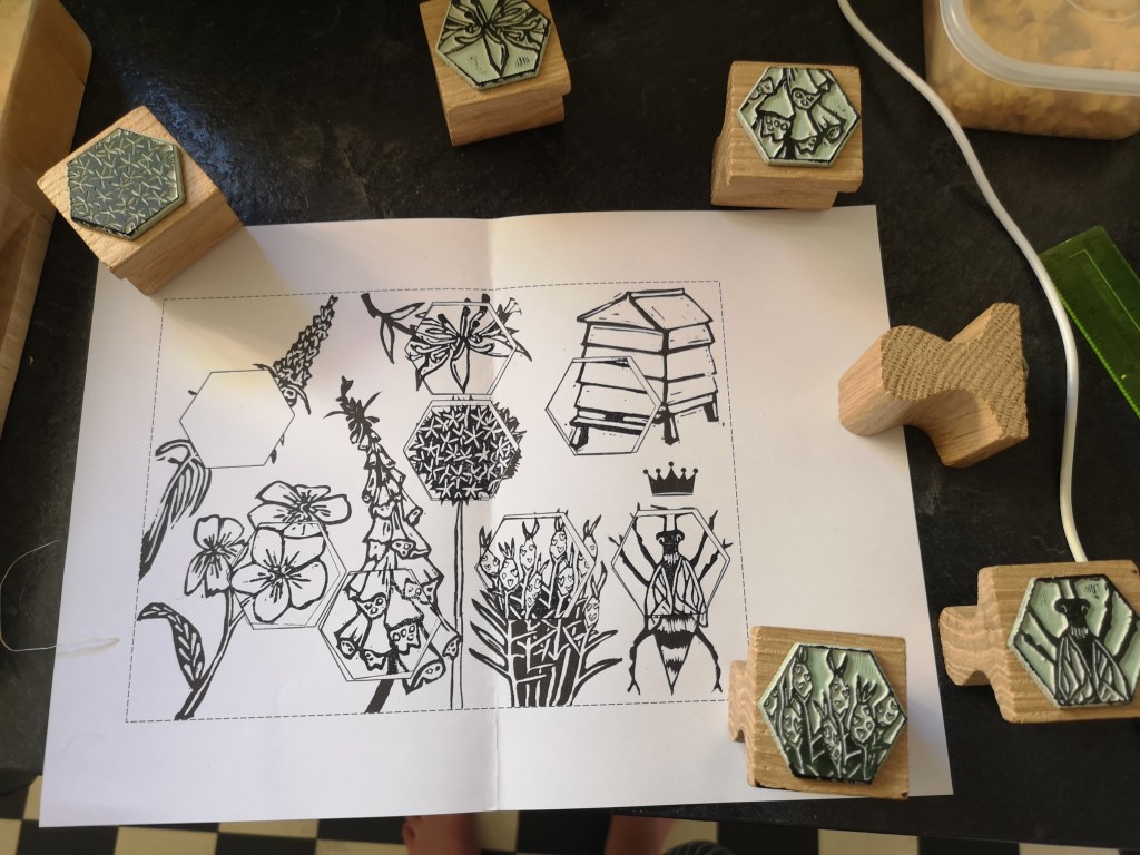 Whilst drawing, I witnessed countless honey bees collecting the nectar and pollen from the flowers. So it didn’t take long to make them my main focus for the trail. This idea developed and I soon decided that the children would not only learn about the honey bees but actually become honey bees!